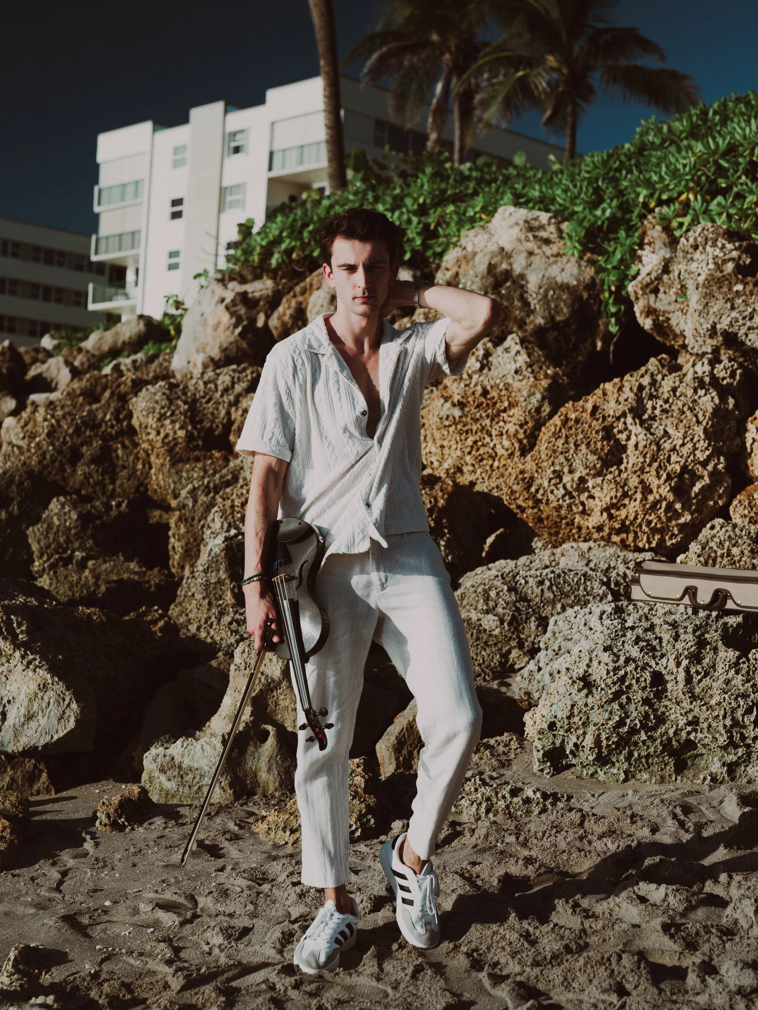 A young man dressed in white, holding a violin and bow, standing on a sandy beach with rocks, palm trees, and a white building in the background during daytime.