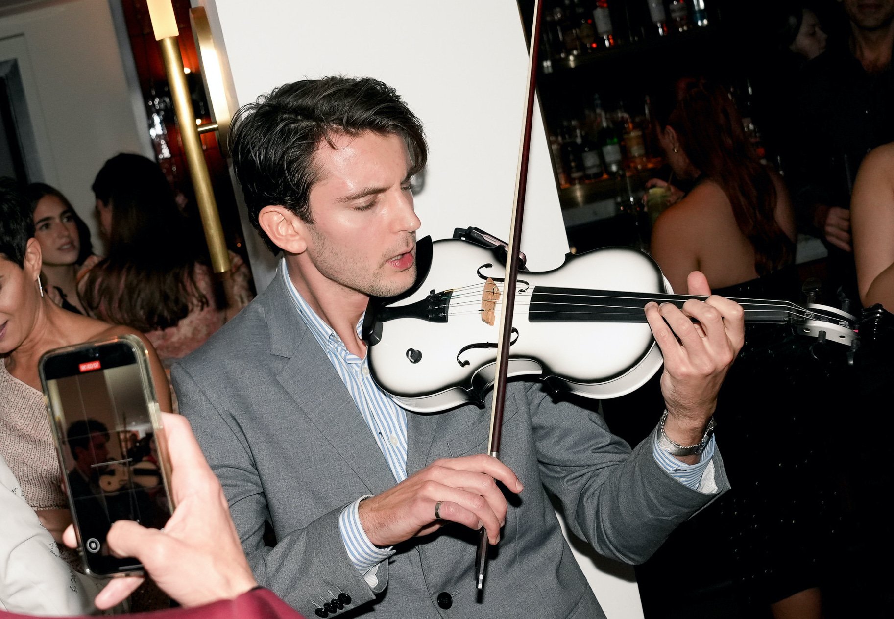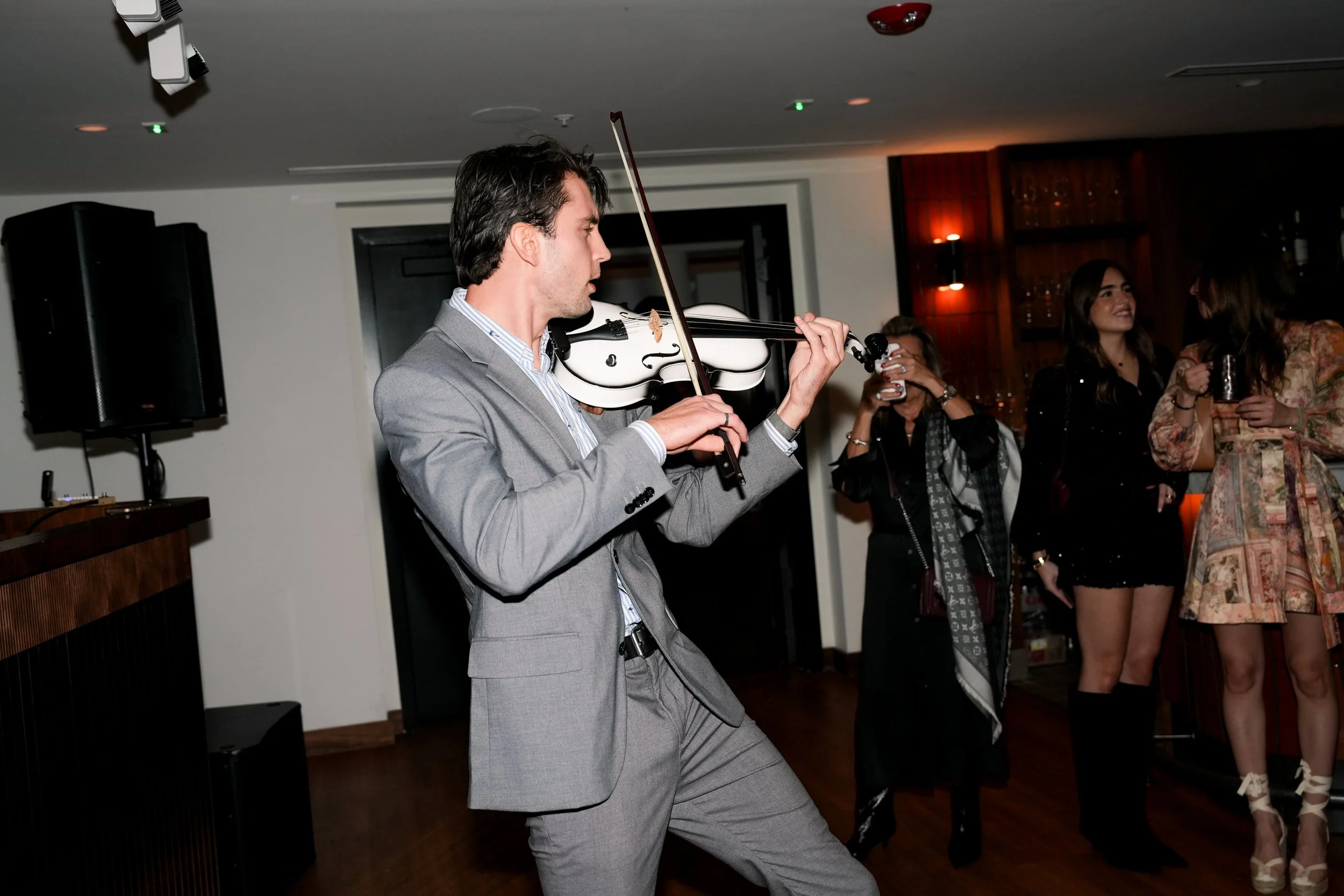 A man in a gray suit playing the violin at a party or event, surrounded by women in formal dresses, some holding drinks and taking photos.