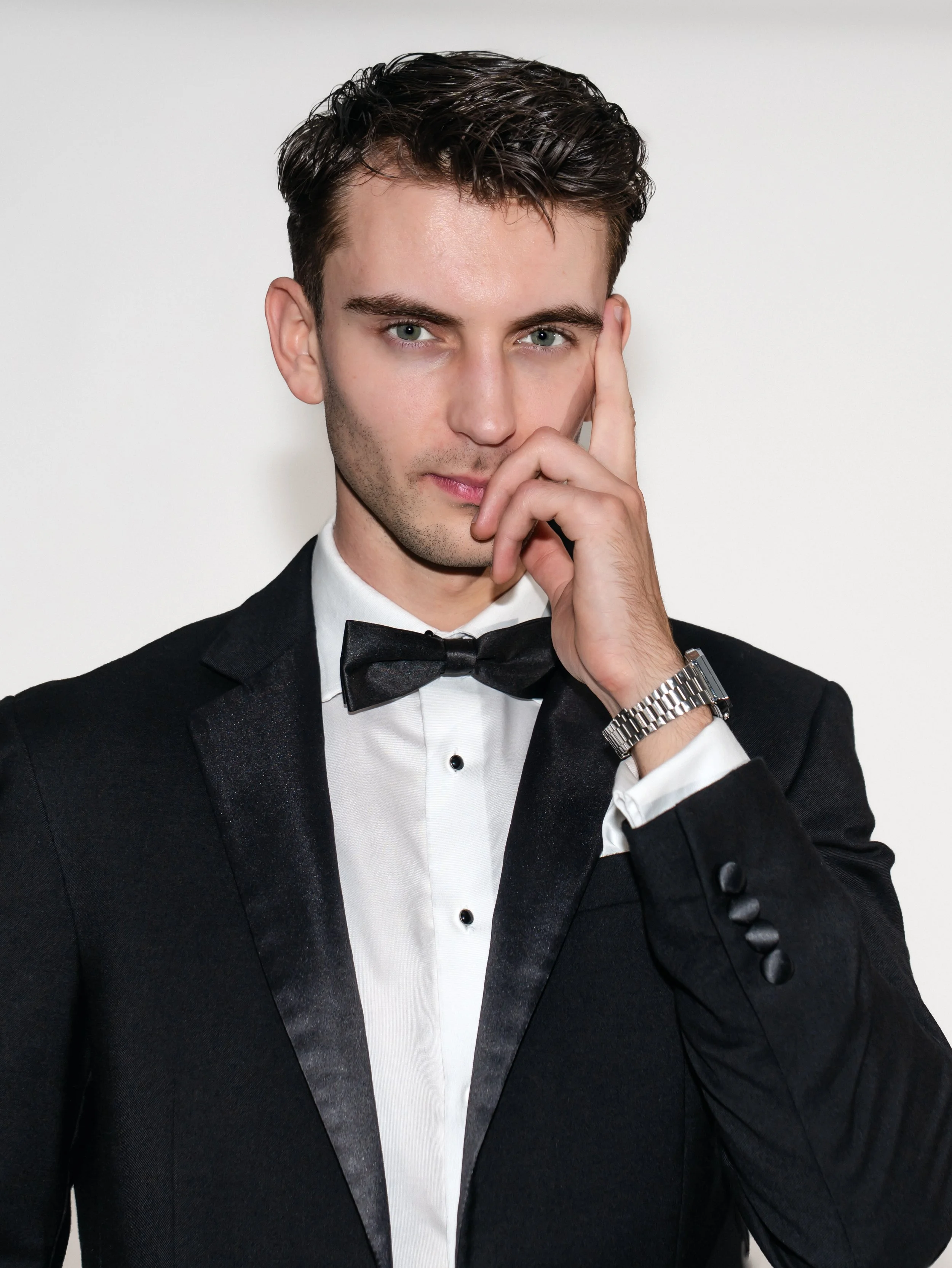 Young man wearing a tuxedo and bow tie, holding his finger to his temple in a thoughtful pose against a plain background.