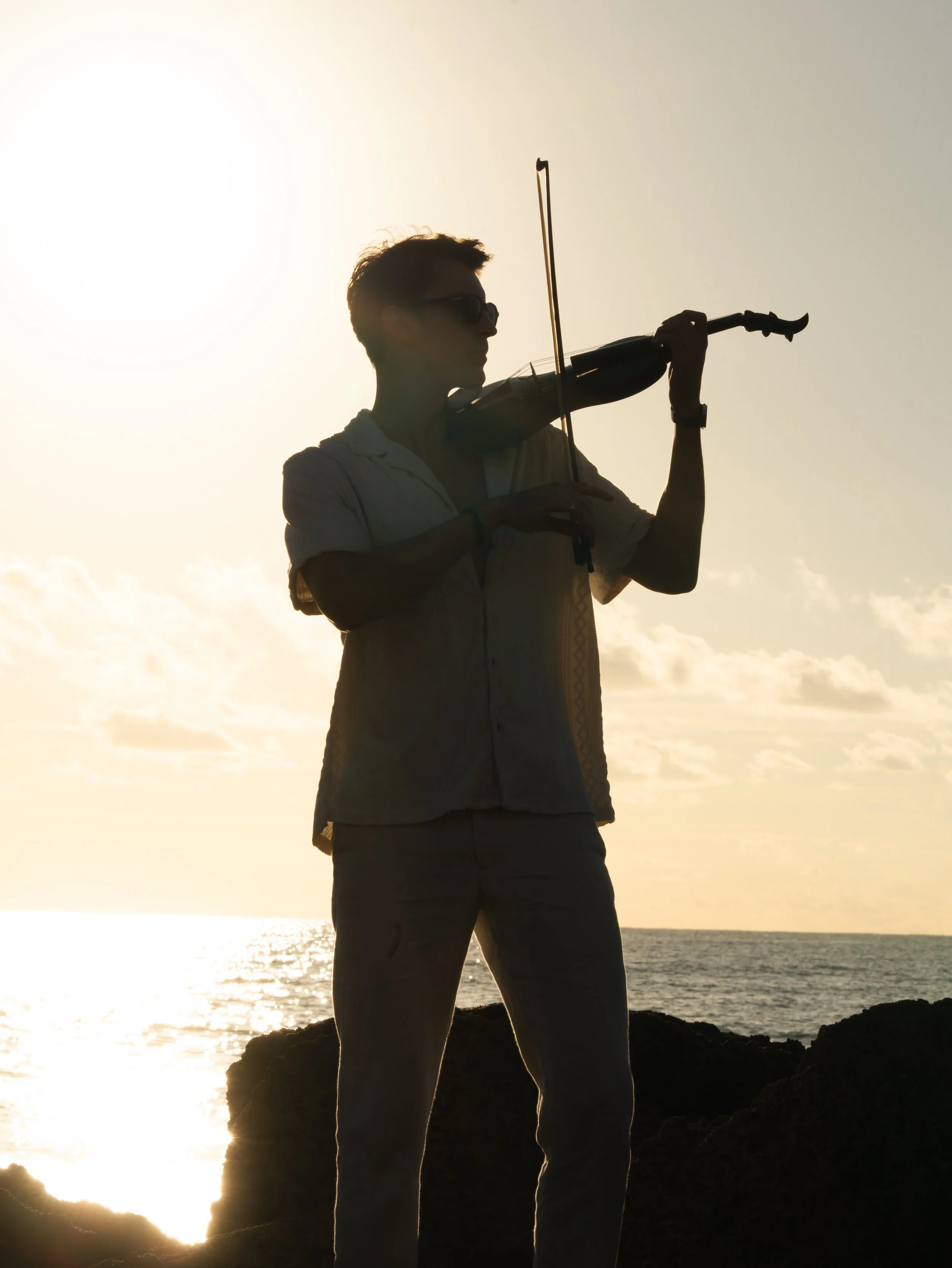 Person playing violin outdoors at sunset near the ocean, silhouette with sunglasses.
