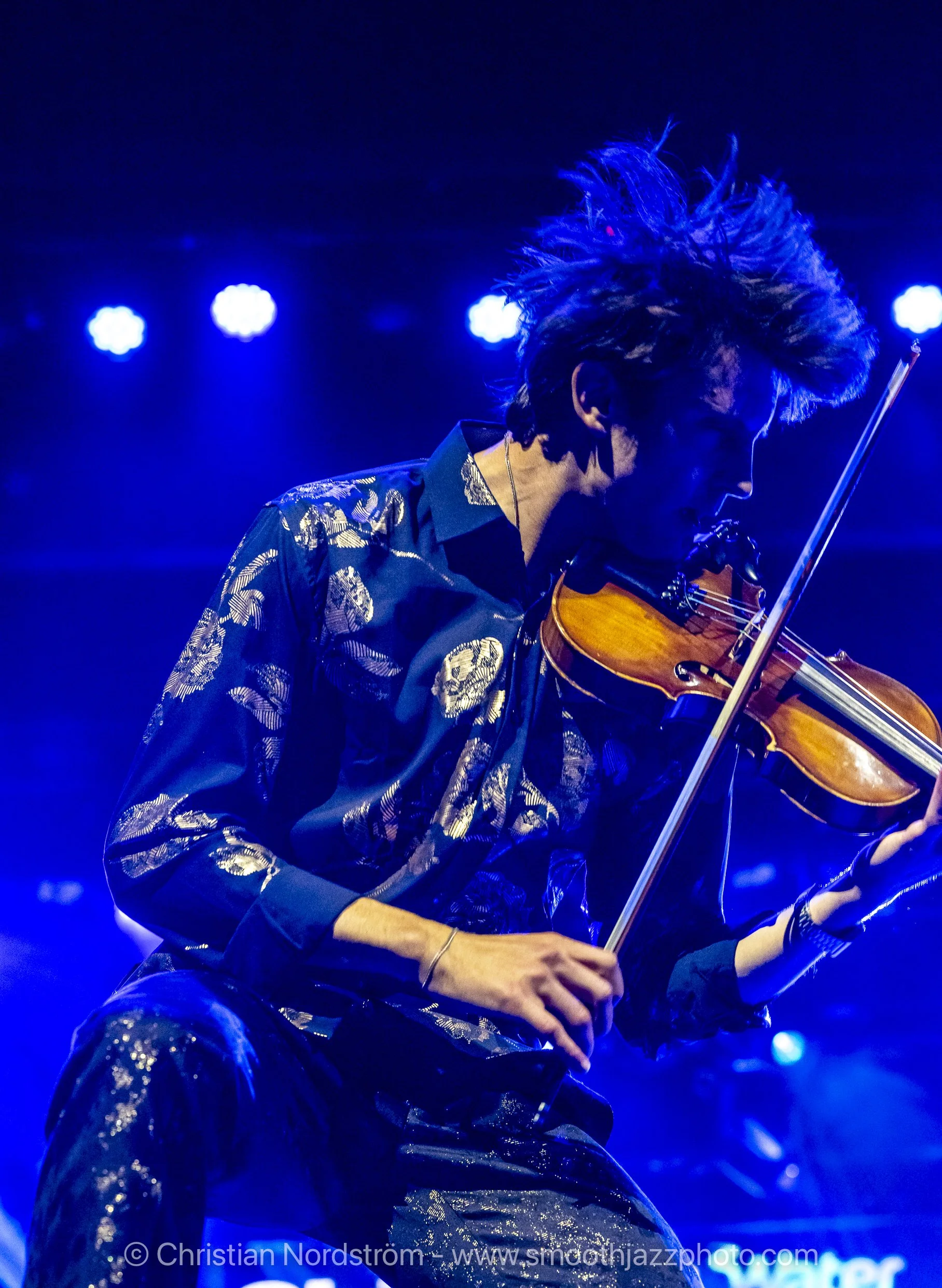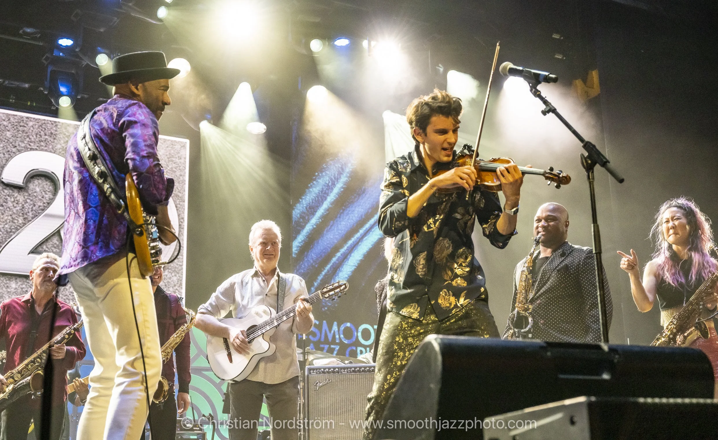 Musicians performing on stage, including a violinist, guitarist, saxophonists, and singers, with colorful stage lighting and a large screen in the background.
