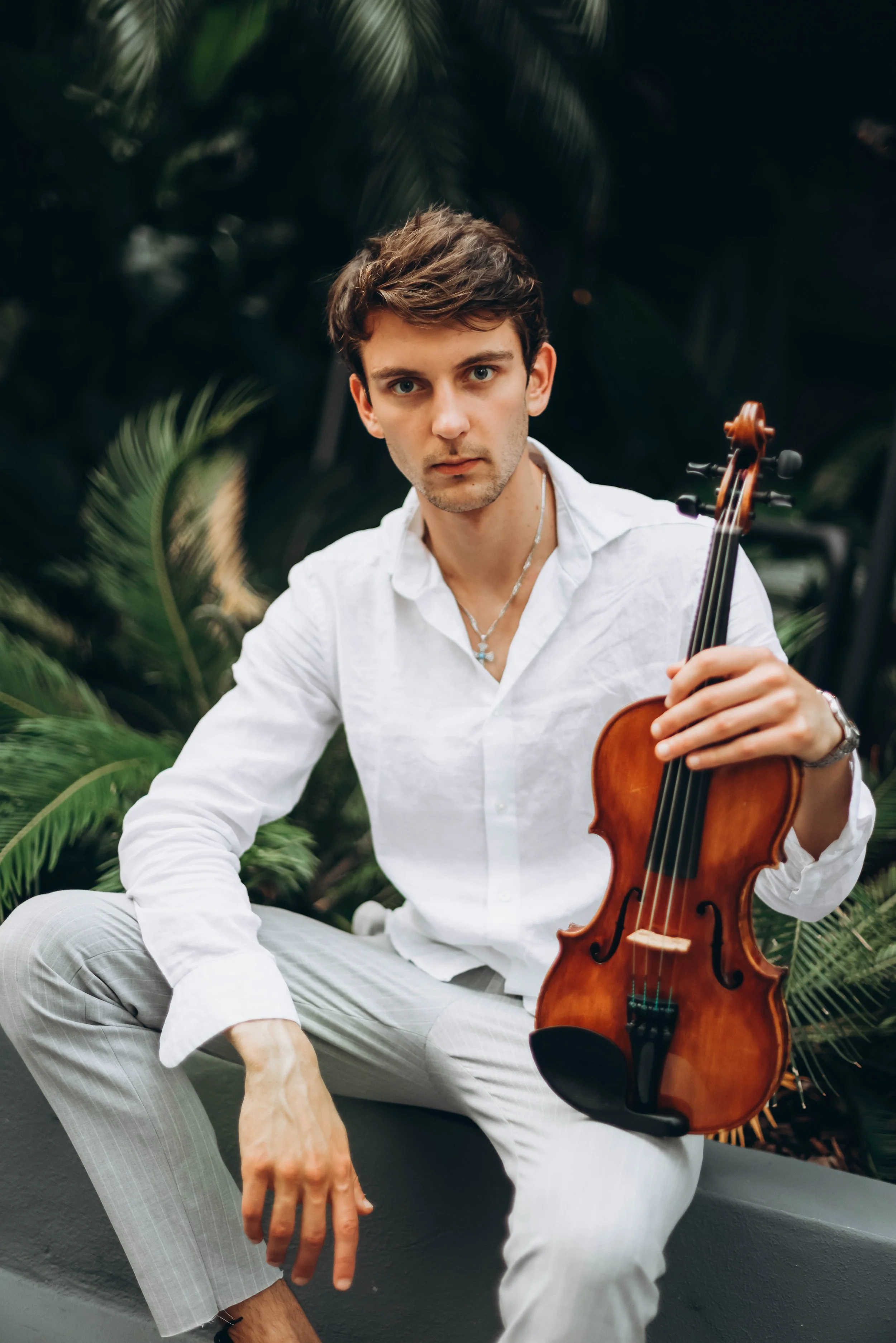 A young man in a white shirt sitting on a ledge, holding a violin, with lush green plants in the background.