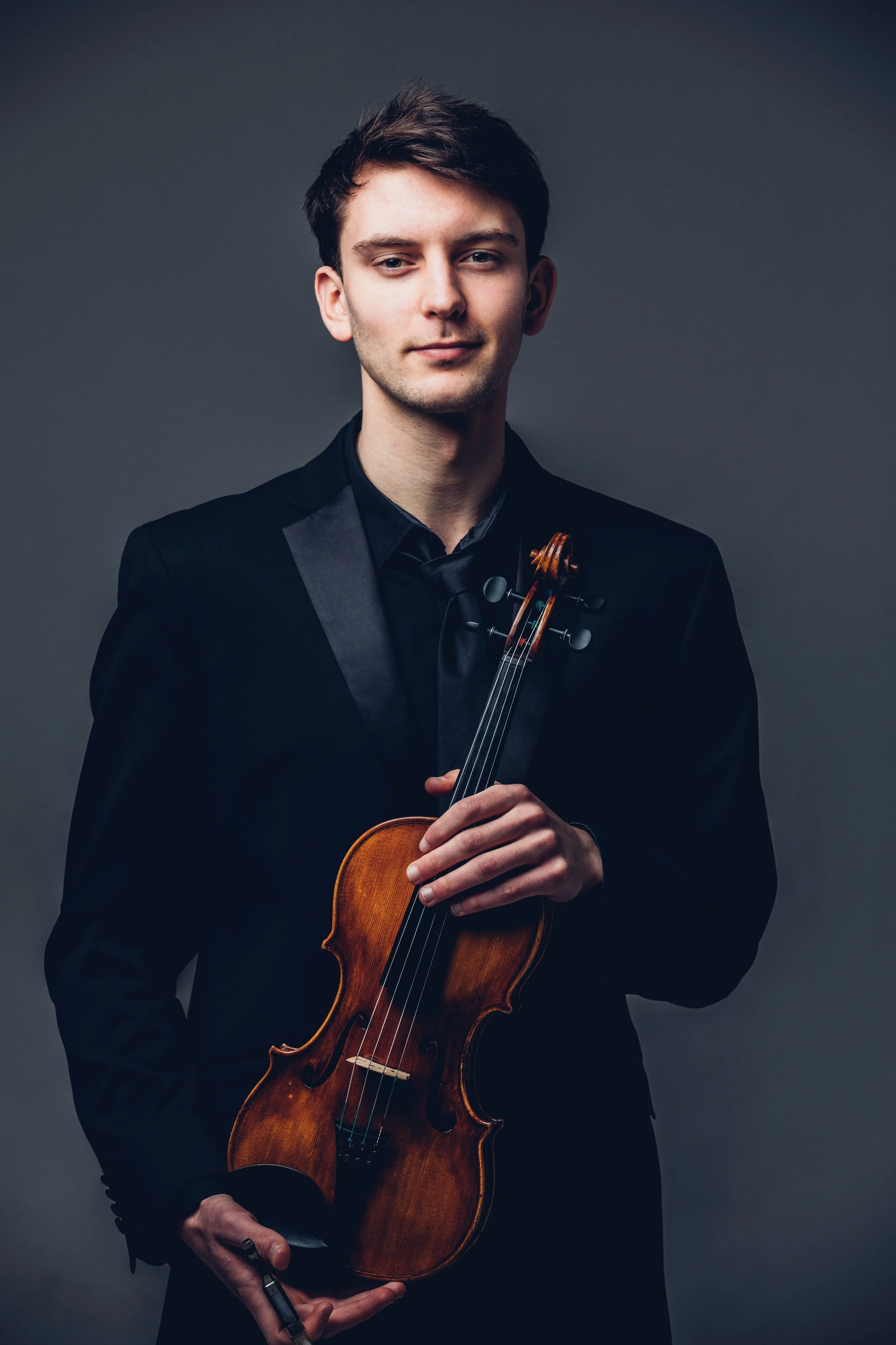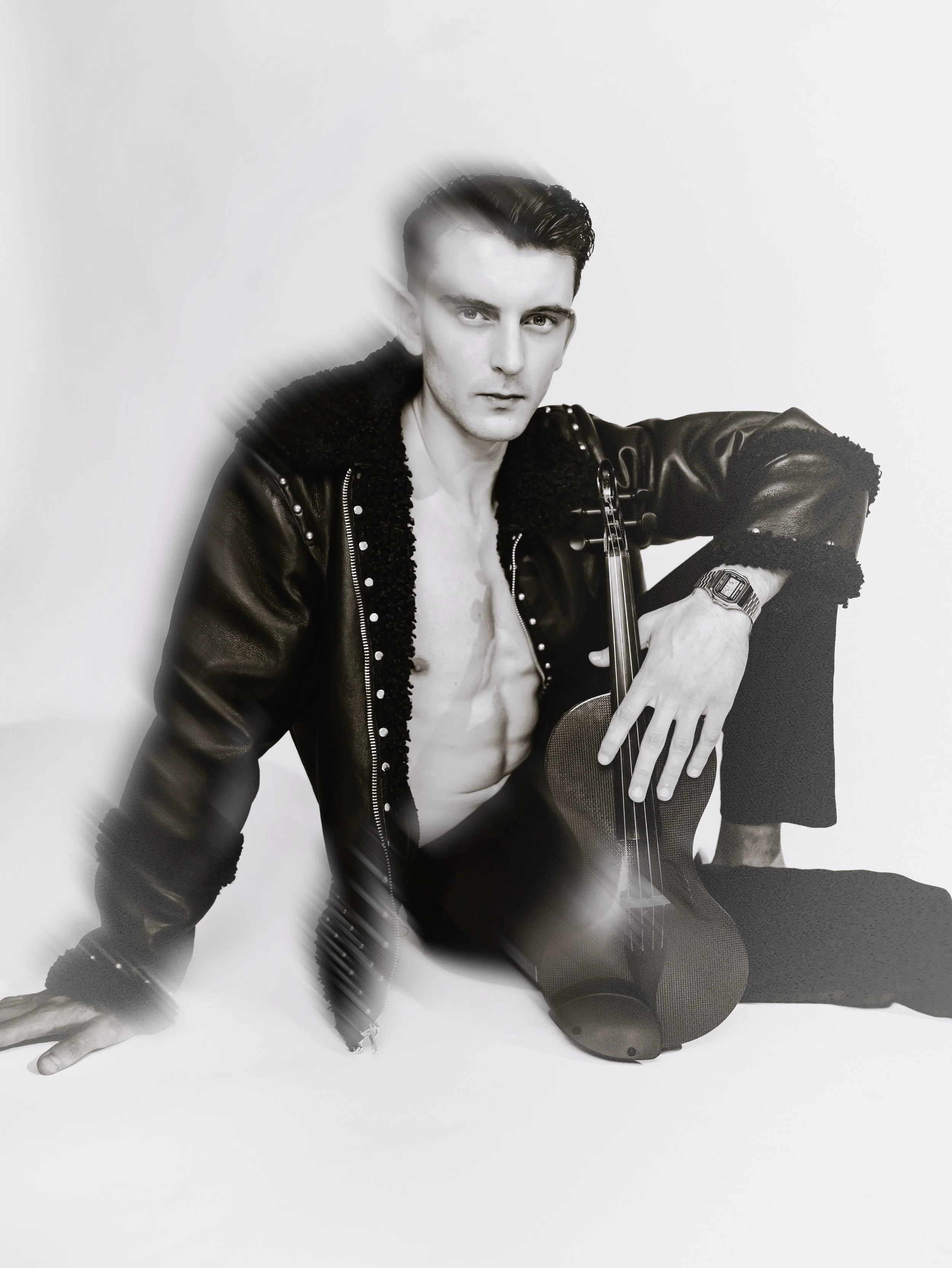 A young man with dark hair, wearing a black blazer with satin lapels and no shirt, sitting on a chair, holding a violin in his left hand, against a plain gray background.